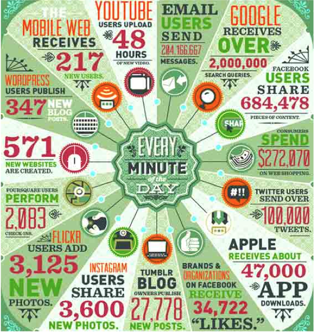 Twitter almacena diariamente cerca de 12 Terabytes de tuits y Facebook almacena alrededor de 100 Petabytes de fotos y videos, ubicación geográfica mediante coordenadas GPS, clic’s de los usuarios, tiempo de permanencia por palabra y hasta ubicación del mouse ¿Imagínate analizar toda esa información.