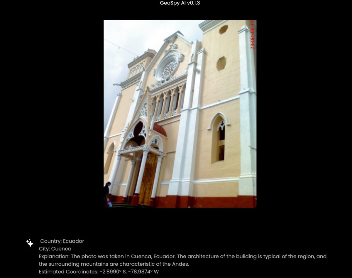 Al subir el archivo de imagen en cuestión, la aplicación te devolverá la ubicación con coordenadas donde cree que se tomó dicha fotografía. Mostrando, además de las coordenadas, el país y la ciudad donde se tomó dicha imagen.