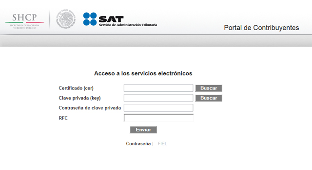 Para utilizar el portal de contribuyentes del SAT solamente necesitarás en una primera instancia ingresar tu certificado (Archivo .cer) y llave privada (Archivo .key) junto con tu contraseña y RFC.