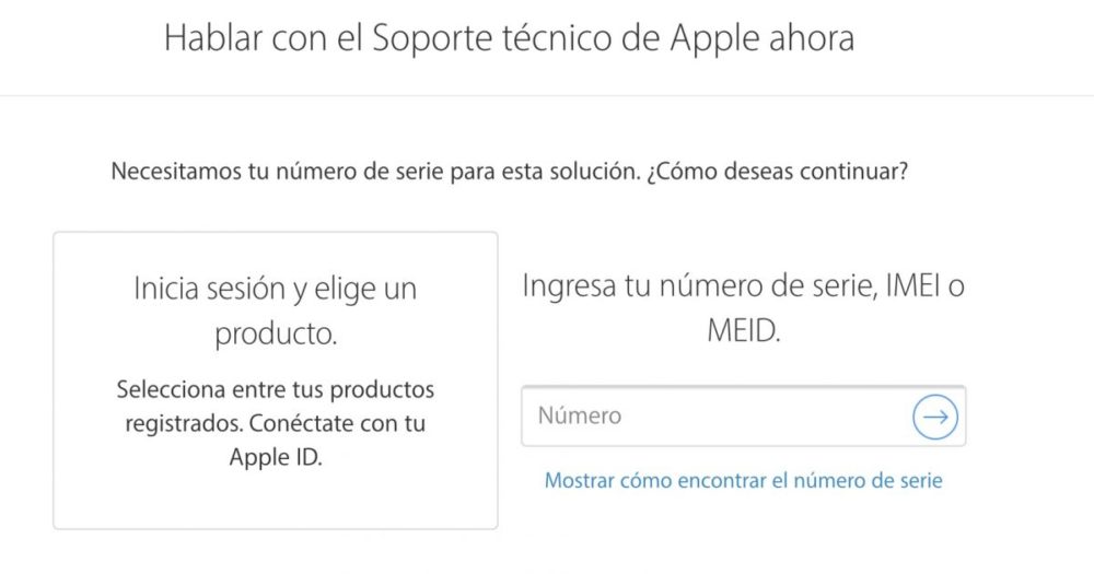 Posteriormente se te redireccionará a una página de ayuda, donde se te preguntará si necesitas soporte vía telefónica o chat. Si eliges la segunda opción deberás ingresar la clave del IMEI o número de serie de tu dispositivo para que puedan identificarlo y brindarte soporte de forma más rápida.