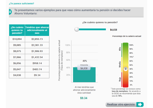 Que de continuar su situación actual habría obtendría los siguientes resultados a la fecha de retiro, un total de $946,263. Con este monto podría alcanzar una pensión de $4,018 mensuales, que equivale al 39.8% de su salario base de cotización (Esto si el trabajador ahorra lo mínimo adicionalmente cada mes)