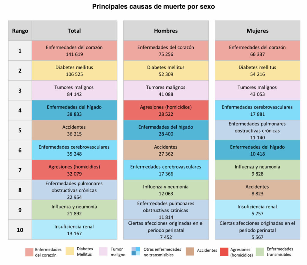 Las tres principales causas de muerte tanto para hombres como para mujeres son las enfermedades del corazón, la diabetes mellitus y los tumores malignos. Los homicidios son la séptima causa de muerte para la población en general