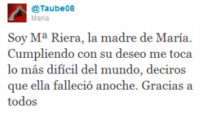 La propia madre de la joven, María Riera, lo anunciaba en la red poco después de su muerte: “Soy M. Riera, la madre de María. Cumpliendo con su deseo me toca lo más difícil del mundo, deciros que ella falleció anoche. Gracias a todos”. Un mensaje muy emotivo que no tardaba en despertar la conciencia de todos. Un alud de ‘tuits’ surgían poco después en la red para apoyar a su madre en estos difíciles momentos.