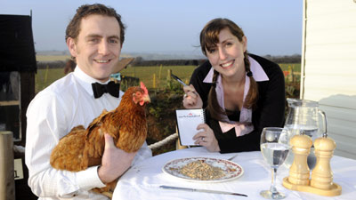 De día los huéspedes puede pasear al aire libre en los terrenos «libres de zorros» de la granja y son llevados a sus camas de lujo por la noche. Por 2 Euros por gallinero, más 1 Euro por cada ave él ha logrado dar alojamiento, comida, seguridad y hasta transporte (al retirar o entregar las aves).