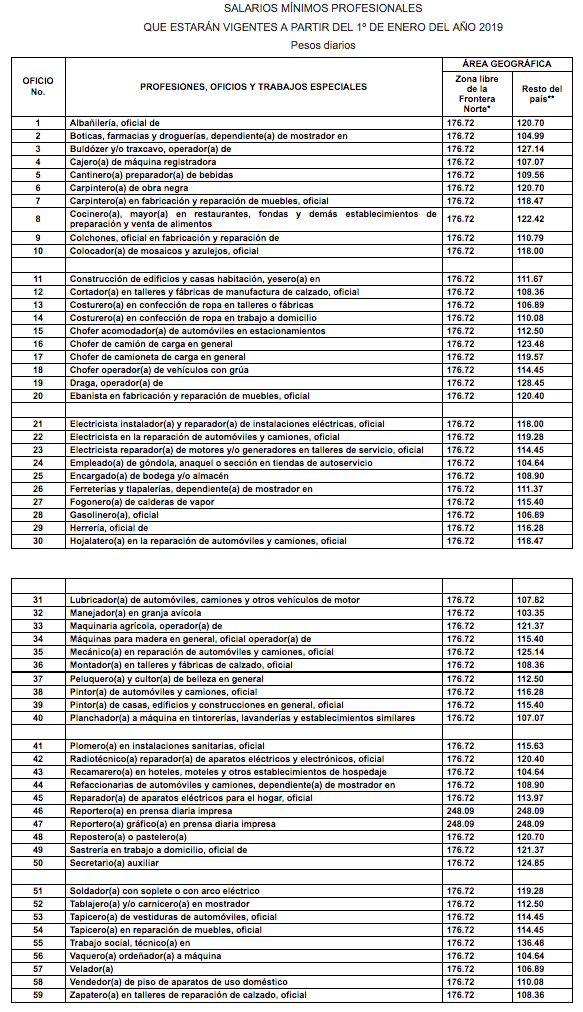 LaComisión Nacional de los Salarios Mínimos informó que los salarios mínimos generales y profesionales estarán vigentes a partir del 1 de enero de 2019 y se dividiran en dos zonas geográficas a lo largo de la República Mexicana.