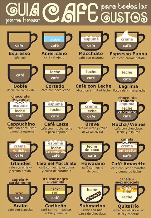 Les dejo una breve guía para hacer café para todos los gusto, en realidad en esta excelente infografía viene explicado de todo un poco, en la que encontraras: