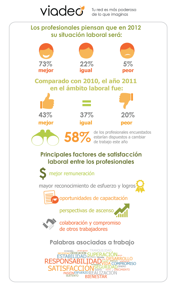 La red Social Viadeo creo una infografía que habla del optimismo que tienen los profesionales de México en cuanto a su desarrollo profesional y de empleo para este 2012. Los resultados arrojaron que el 43.5% de los encuestados cree que su situación laboral es mejor que el año pasado, sin embargo, el 58% cambiaría de trabajo si pudiese durante el 2012 y el 73% espera mejorar su satisfacción laboral este año.