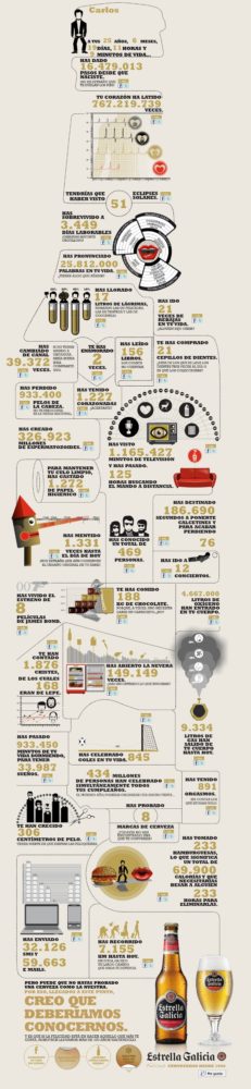 Pero realmente alguna ves has intentado crearte una inforgrafia a ti mismo. La empresa de cervezas Estrella Galicia lanzó en España una campaña publicitaria bajo el nombre “Deberíamos conocernos”, con la que creará una infografía tuya Con solo ingresar tu nombre y tu fecha de nacimiento.
