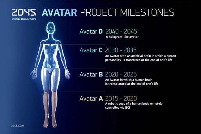 Para 2020, Itskov pretende lograr una copia robótica de un ser humano que pueda ser controlado directamente mediante un interfaz BCI (Brain Computer Interface) y para 2025, la iniciativa espera poder extirpar un cerebro humano y mantenerlo vivo, conectándolo directamente al avatar robótico.