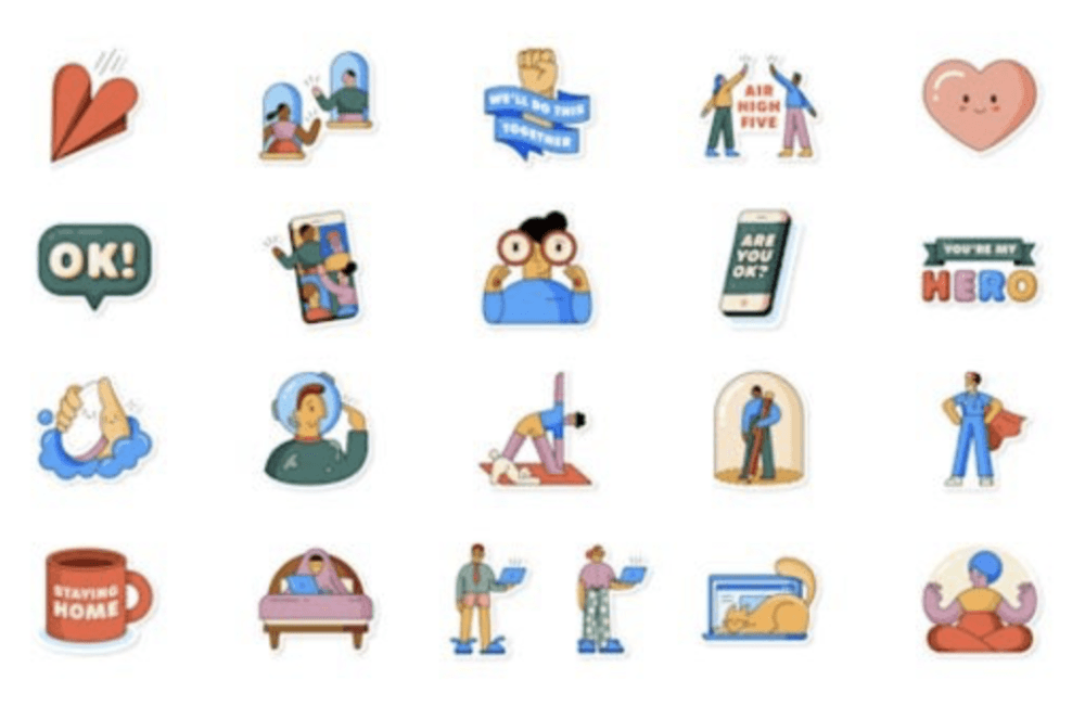 Este pack de sticker incluye elementos que nos recuerdan que debemos lavarnos las manos de manera constante, que el teletrabajo está de moda, que en casa también se puede hacer ejercicio. Otros stickers incluyen frases como “Eres mi héroe/heroína” o “Saldremos de esto juntos”.
