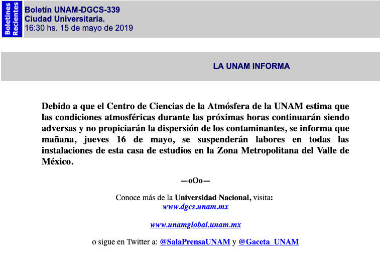 Durante la semana en la Ciudad de México se visto muy contaminada debido a los incendios que se han generado alrededor, es por esto que varias instituciones dieron a conocer que habrá suspensión de clases para el jueves 16 de mayo del 2019.