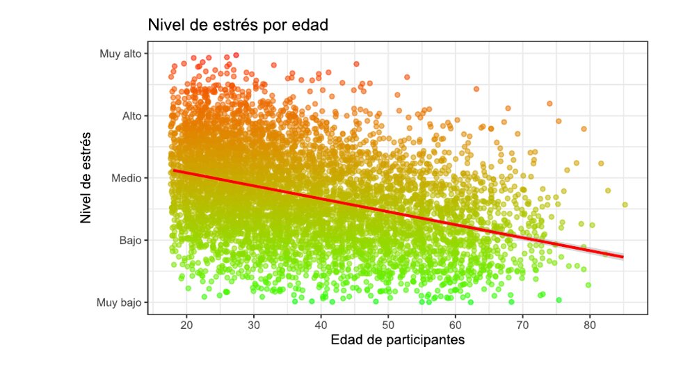 Los jóvenes de alrededor de 20 años, que son la mayoría, reportaron un grado superior de estrés, que va descendiendo con los años; las personas de 65 años tienen un puntaje sensiblemente más bajo en la escala utilizada y esto puede deberse a que la gente de más edad está menos interesada en lo que circula en las redes sociales o en las noticias del día a día y tienen más apoyo social, entre otras razones de tipo socioeconómico.