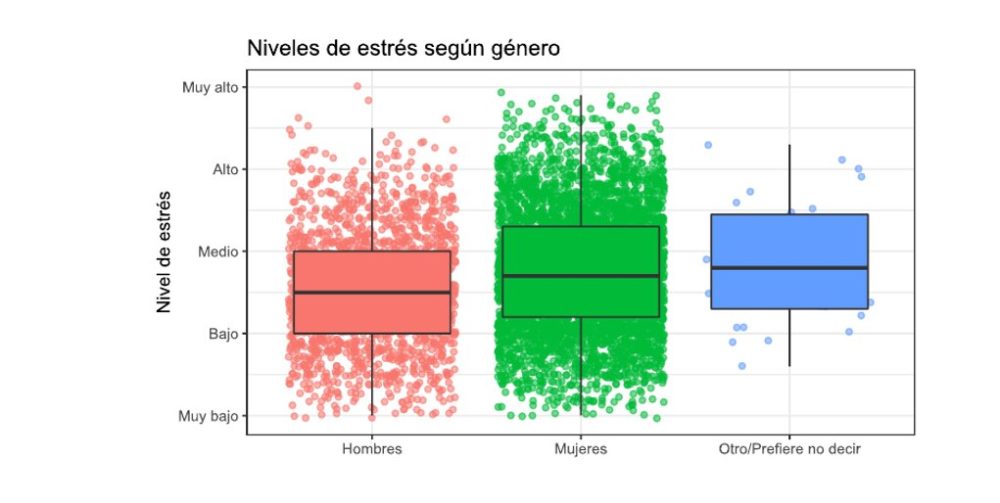 Las gráficas muestran que las mujeres experimentan más tensión física o emocional que los hombres y quienes se identifican en forma no binaria registraron categorías aún más altas, en relación con los grupos anteriores. Debido al confinamiento y el tener que lidiar con dobles responsabilidades como cumplir doble rol de ser el sostén de la casa, más a parte ser quien cuida a lo niños.