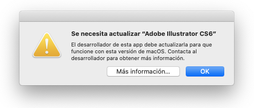 Al tratar de abrir la aplicación se muestra un mensaje que indica que se debe de actualizar para que se pueda utilizar con esta nueva versión de macOS.