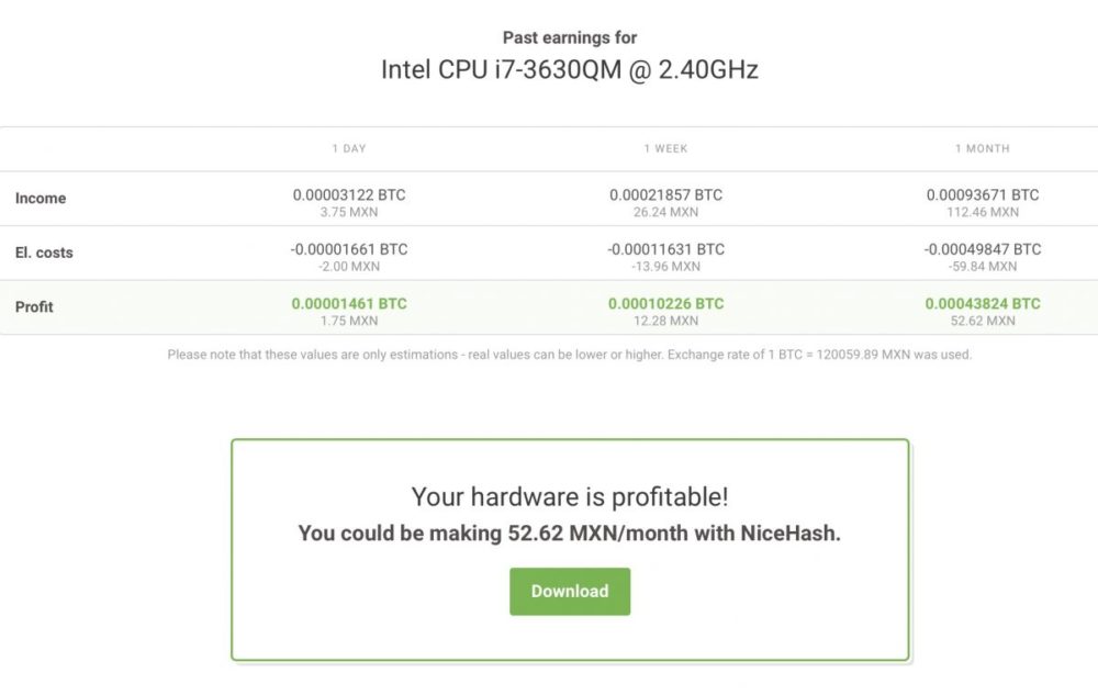 Para las personas que desean invertir en hardware para minar bitcoin, existe la página web NiceHash que te permite saber, a través de la selección del hardware compatible, cuantos BitCoins podrías ganar tras un día, una semana o un mes de minado con tu CPU encendido todo el tiempo.