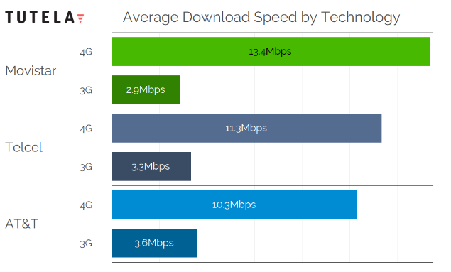 La velocidad de descarga promedio en 4G de Movistar es de 13.4 Mbps; mientras que Telcel sigue con un promedio de 11.3 Mbps y AT&T exactamente a 1 Mbps de distancia de Telcel, con 10.3 Mbps. En 3G, el orden se invierte, ya que AT&T ocupa el primer lugar, con 3.6 Mbps, Telcel con 3.3 Mbps y Movistar con 2.9 Mbps.