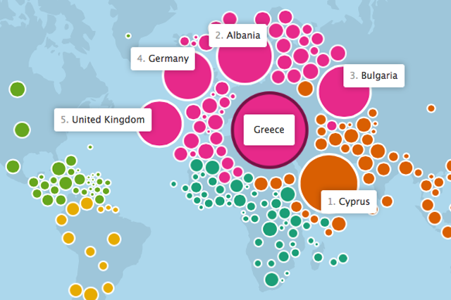 El mapa usa gráficos de burbujas donde al seleccionar un país uno puede ver que los habitantes de Chile tienen más amistades en Facebook con gente de Argentina, luego Perú, España, Colombia y Venezuela.