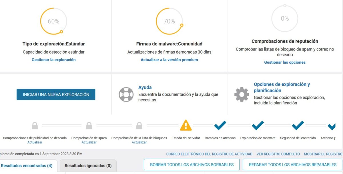 11.- Ahora, instala un plugin de seguridad, a mi me gusta usar Wordfence (en su versión gratuita), ya que tiene un buen escáner de malware. Tras instalarlo realiza un primer escaneo, si detecta algún archivo modificado, habrá que restaurarlo a su versión original.