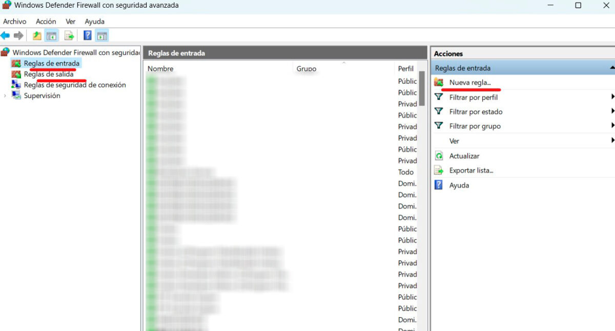 Abrirá una nueva ventana donde podremos dar seguimiento a las reglas del Firewall de Windows. El siguiente procedimiento lo vamos a realizar tanto para la opción que tenemos del lado izquierdo que se llama Reglas de Entrada y En Reglas de Salida. (Muy importante hacerlo en las 2)