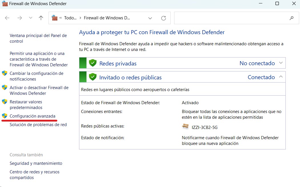 En Windows abrir el menú inicio y ahí escribir «Firewall de Windows Defender» (Sin las comillas), esto nos abrirá una nueva ventana. En la columna de la izquierda deberás dar clic en el botón que dice Configuración Avanzada.
