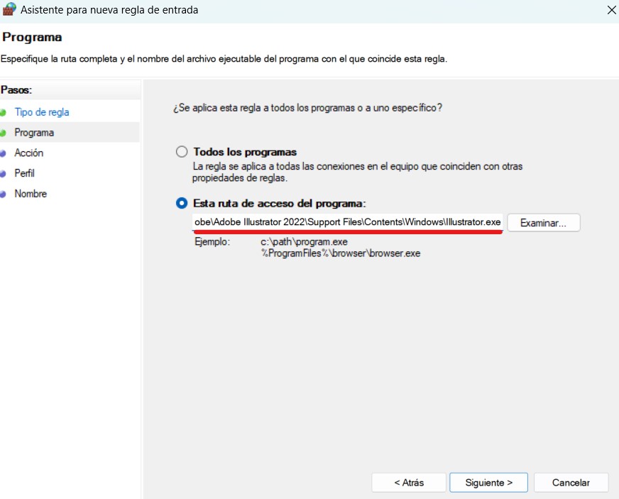 2- En el asistente que nos abrirá colocaremos la opción de «Programa» > Seleccionamos la ruta del programa y en el botón de Examinar localizamos el archivo ejecutable de Adobe Photoshop y Adobe Illustrator. Normalmente los programas se encuentran instalados en esta Ruta (Puedes copiar y pegar para que quede como en la imagen)