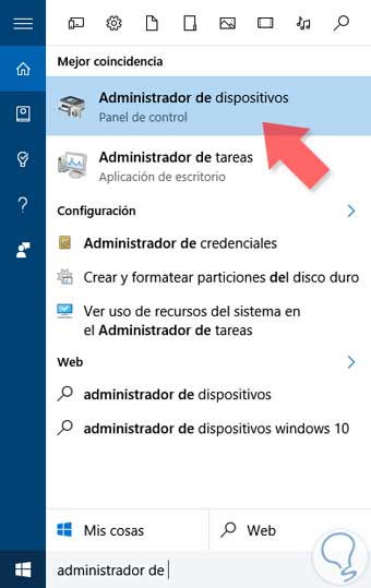 En el icono de buscar de Windows 10 escribe la palabra “Administrador de dispositivos” y te abrirá una ventana nueva.
