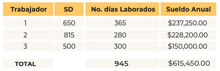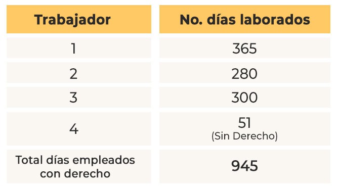 En el ejemplo anterior los 4 colaboradores (Excluyendo al que laboró menos de 60 días) en total sumaron 945 días laborados, por lo tanto: $22,800 / 945 = 24.12698