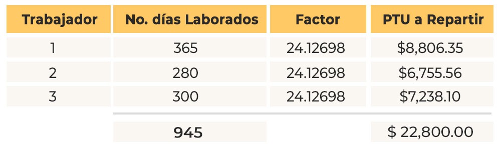 El 50% de las utilidades (es decir 22,800 pesos), será repartido de forma proporcional entre el total de días laborados por los trabajadores (para que el reparto sea proporcional al número de días laborados).
