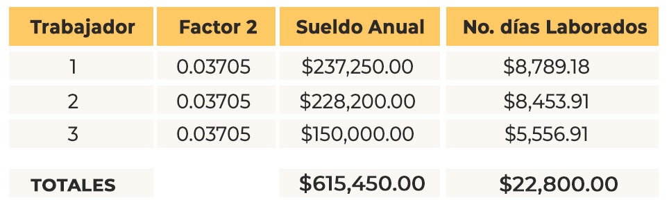 Aquí obtenemos un siguiente factor que es el monto a repartir de PTU (50% restante) entre el total de salario pagado: $22,800 / $615,450 = 0.03705