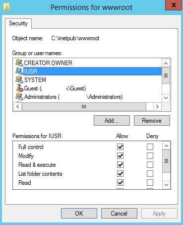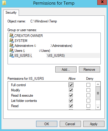 El motivo por el que sucede esto, la carpeta de archivos temporales y tu directorio Inetpub. Lo que debes hacer es, desde el explorador de Windows dirigirte a la carpeta C:\Windows\ y darle clic secundario a la carpeta Temp posteriormente en la opción de «Propiedades -> Seguridad» y ahí deberás agregar dos nuevos usuarios: IUSR y IIS_IUSR .