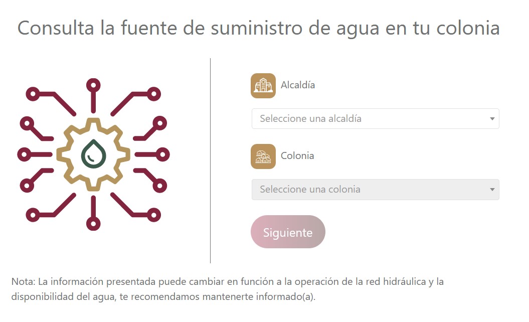 Para conocer los horarios de distribución de agua que tendrán las diferentes colonias de la Ciudad de México el Sistema de Aguas de la Ciudad de México creó el portal de Internet Agua en tu Colonia, a través del cual las personas podrán consultar los horarios en los que recibirán agua.