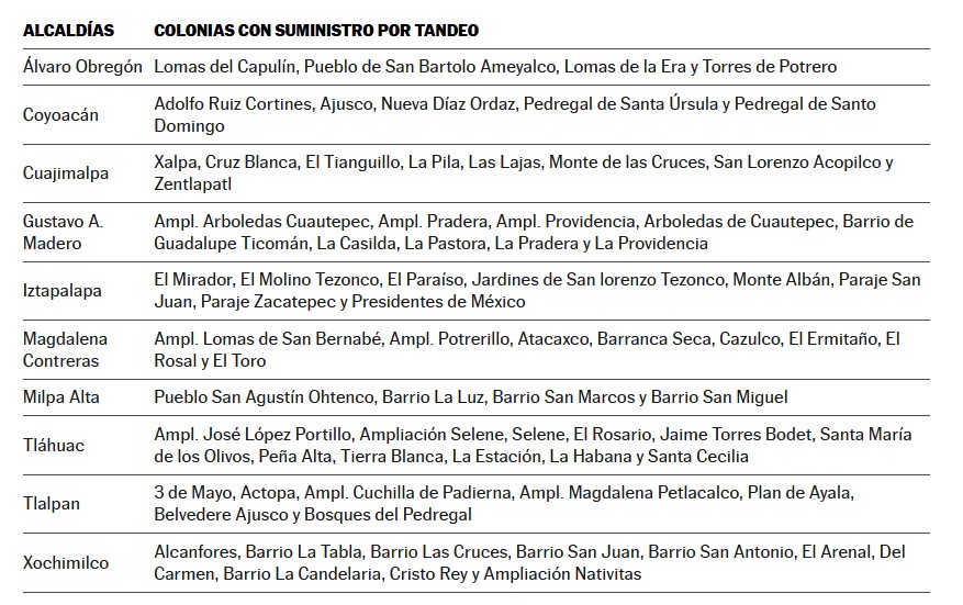 Esto significa que, durante las siguientes semanas los habitantes de las alcaldías: Álvaro Obregón, Cuajimalpa, Coyoacán, Gustavo A. Madero, Iztapalapa, Magdalena Contreras, Tláhuac, Milpa Alta, Tlalpan y Xochimilco estarán recibiendo el servicio de agua a modo de tandeo, es decir, recibirán solo por horas al día el agua en sus hogares.