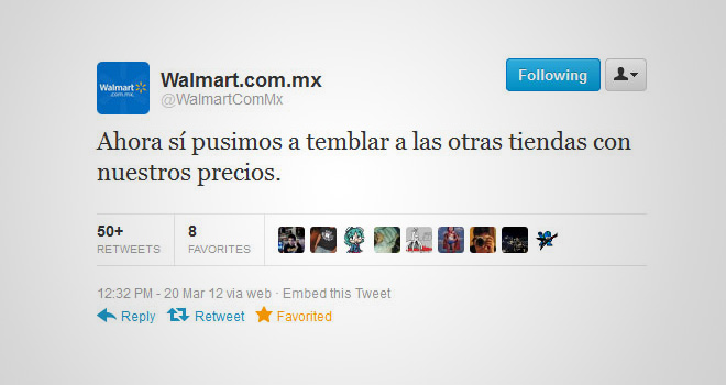 El Community Manager de Walmart México el día de hoy cometió un grave error porque poco después de ocurrido el terremoto de 7,8 grados Richter en la región de Guerrero, México, apareció en la cuenta de Twitter de Walmart México el siguiente mensaje: